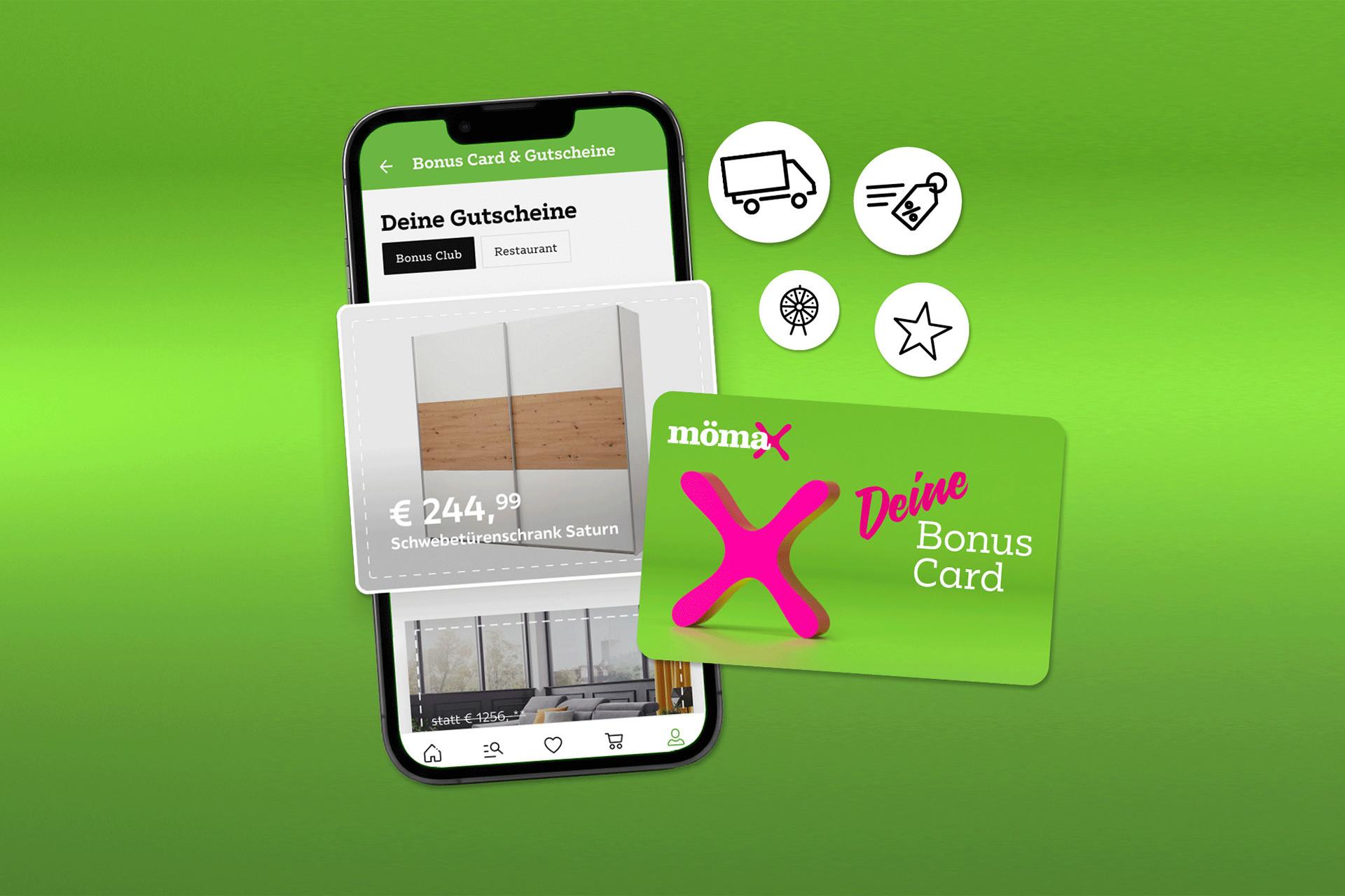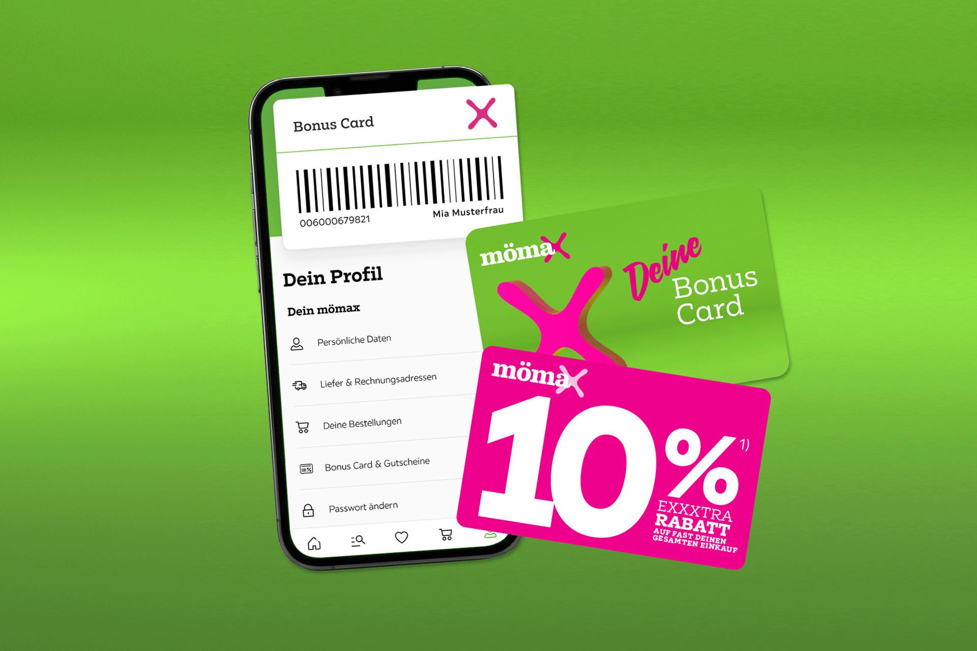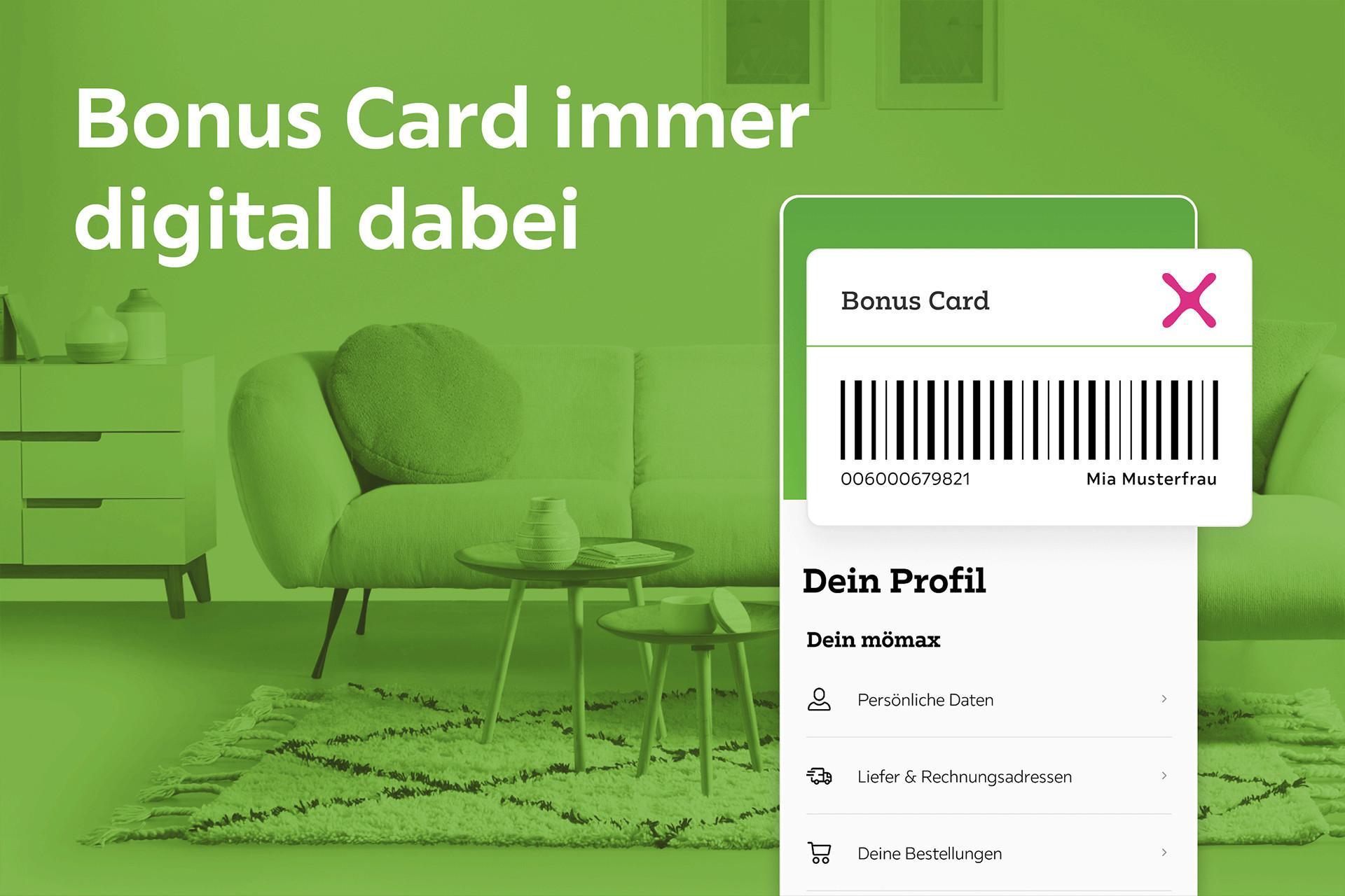 - mömax Bonus Card einmalig verknüpfen und jederzeit digital nutzen