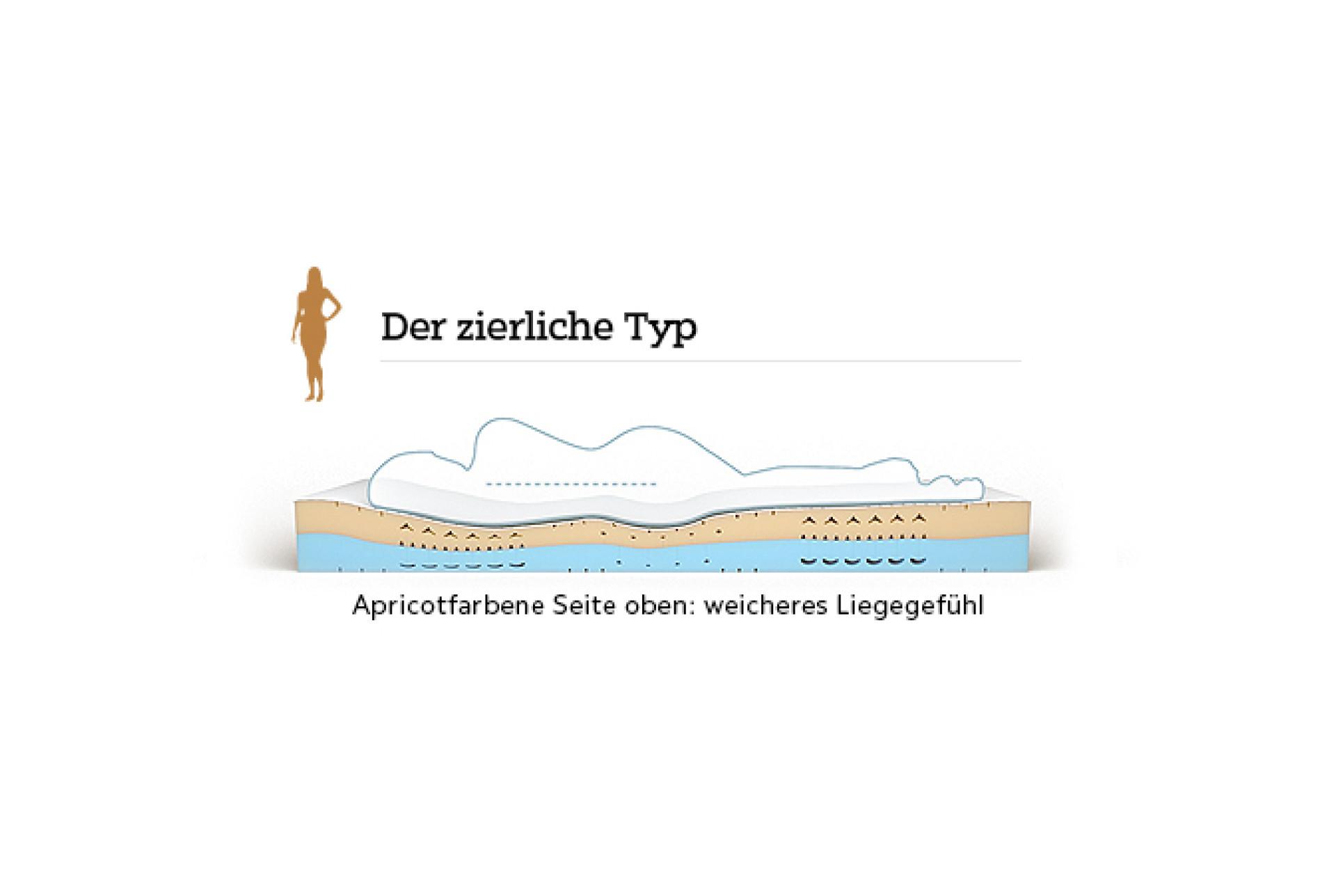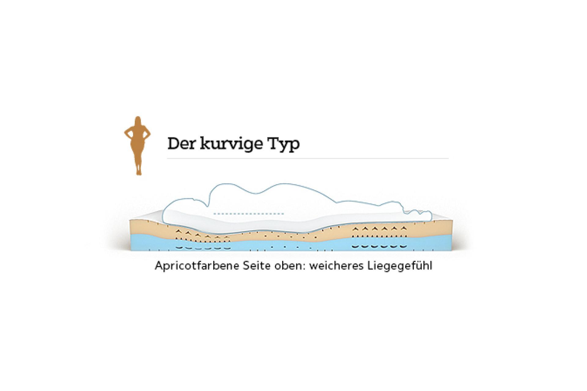 • Der hochelastische XTSchaum® der apricotfarbenen Kernseite sorgt für ein weiches Liegegefühl (H2) und eine punktgenaue Druckentlastung und ist ideal für zierliche und kurvige Körpertypen bis ca. 80 kg.