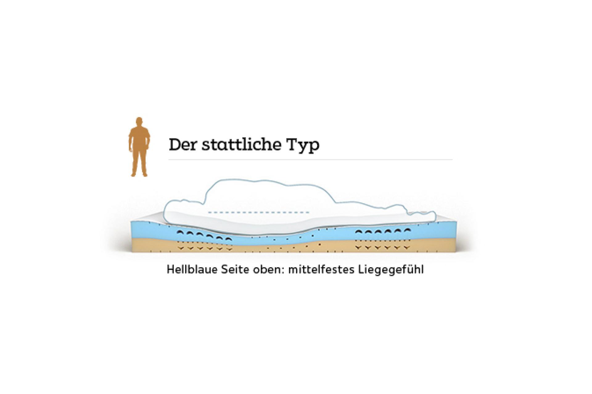 • Die hellblaue Kernseite der BODY STAR® Matratze eignet sich mit ihrem mittelfesten Liegegefühl (H3) für stattliche und athletische Körpertypen. Sie ist auf ein Körpergewicht zwischen 80 und 150 kg ausgelegt, fest und elastisch zugleich.