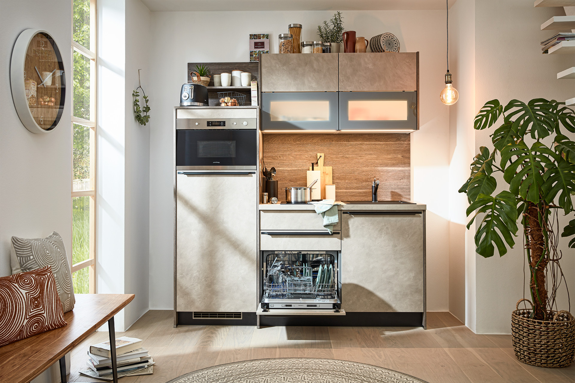 Die Produktserie Base besticht primär durch ihr zeitloses Design – Dekore in Beton steinweiß, Zement, Beton hell und Stahl dunkel überzeugen mit ihrem cleanen Stil. Die Fronten beeindrucken mit einer Melaminharz-Oberfläche und einer umlaufenden, dekorgleichen Dickkante, und auf der wasserabweisenden Arbeitsplatte werden die Vorbereitungen für ein leckeres Essen ein Kinderspiel. Dank eines durchdachten Beleuchtungskonzepts mit insgesamt 11 Unterbauleuchten entsteht ein warmes, wohliges Ambiente. Zudem bieten zahlreiche raffiniert integrierte Flächen viel Platz für Dekoration und Accessoires.