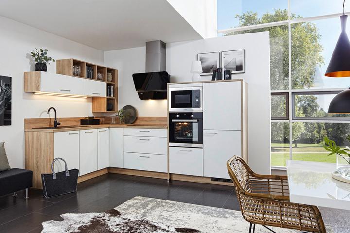 Mit Express Win stimmen Sie das Küchendesign ganz einfach auf Ihre Stilvorlieben ab. Schlichte, aufgesetzte Griffe in Edelstahloptik harmonieren besonders schön mit dem grifflosen Wand-Klappschrank. Praktisch sind der Backofen und die Einbaumikrowelle auf ergonomischer Höhe, genauso wie der Besteckeinsatz direkt unter dem Kochfeld, mit dem alle Küchenutensilien jederzeit einsatzbereit sind. Ein besonderes Highlight sind der Dunstabzugsschrank mit Push-to-Open-System und bei den Schranktüren und Schubladenauszügen kommt standardmäßig ein weiteres Top-Feature zum Einsatz: Dank Soft-Close-System klappern in der Küche nur mehr Töpfe, Deckel und Kochlöffel und keine zufallenden Türen. Bei einem Schenkelmaß von ca. 280/175 cm sowie einer großzügig dimensionierten Kühlschranknische bietet die Küche mit schwarzen Akzenten ausreichend Platz und versprüht edlen Charme.