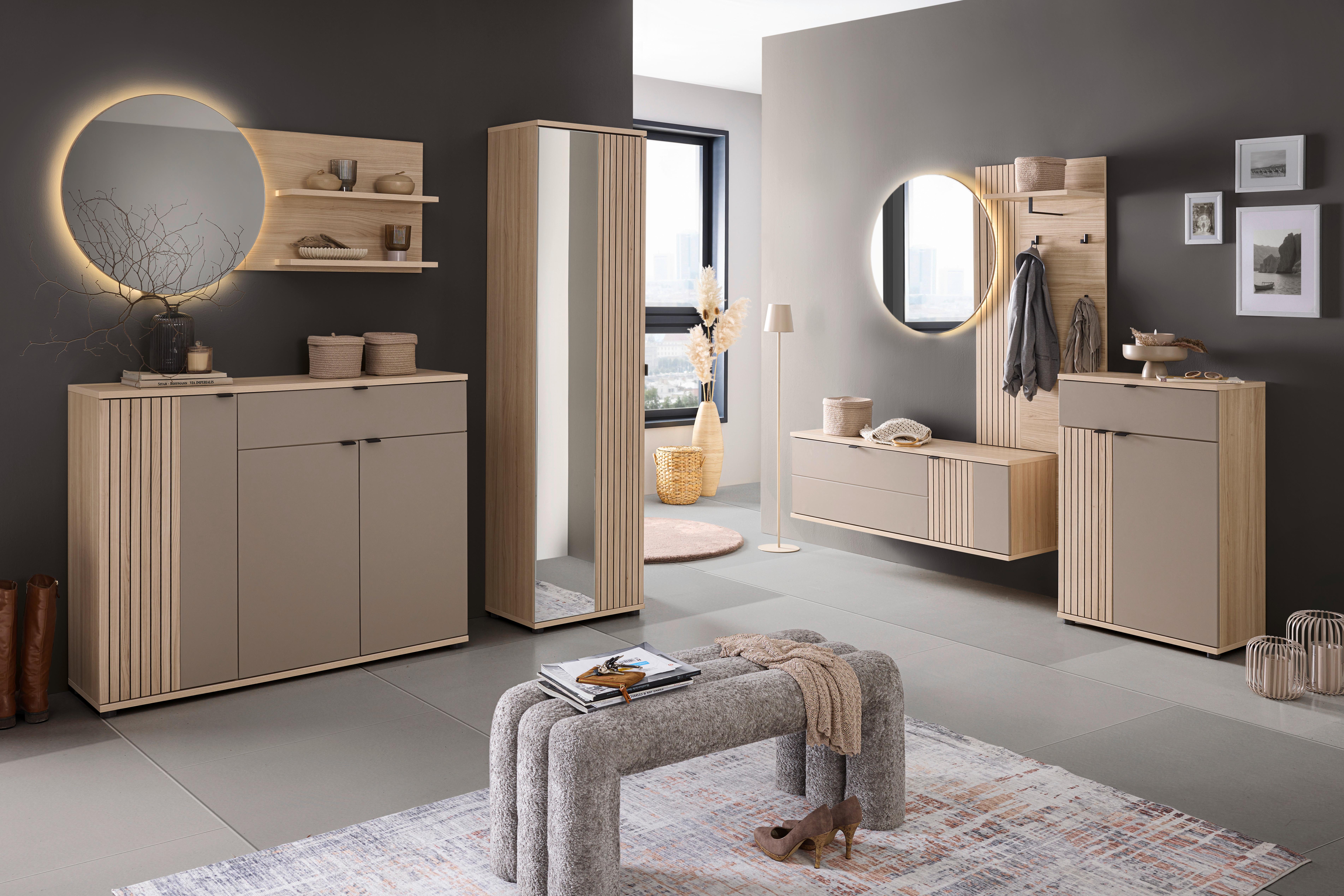 Die Garderobenserie Pisa in Taupe/Eichefarben vereint zeitlose Eleganz mit natürlicher Behaglichkeit und sorgt für einen freundlichen, stilvollen Eingangsbereich. Das dezente Taupe harmoniert perfekt mit der warmen Eicheoptik und setzt ruhige, geschmackvolle Akzente, die sich nahtlos in verschiedenste Wohnstile integrieren lassen.