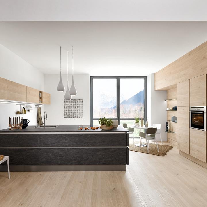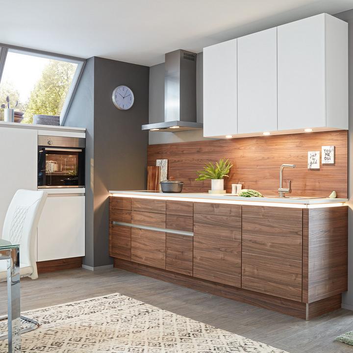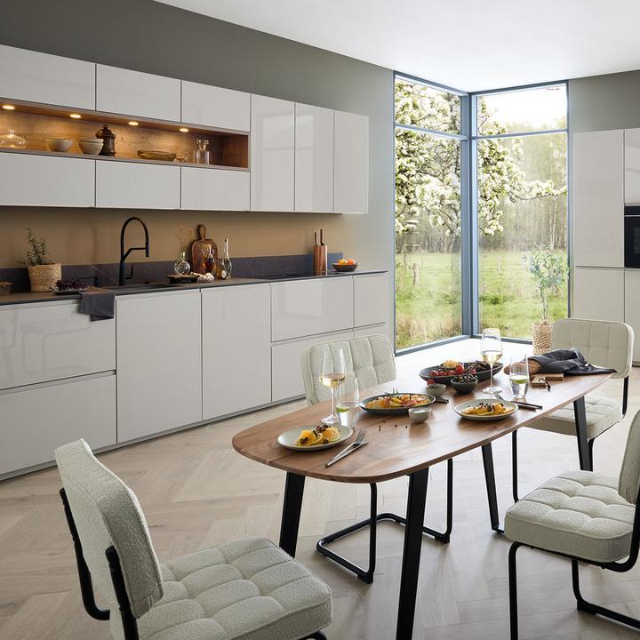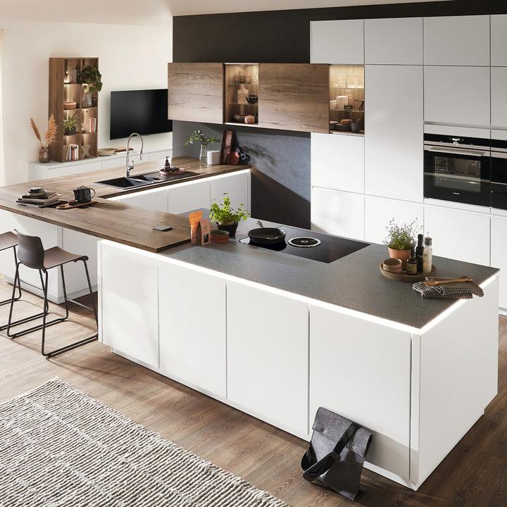 Passen muss eine Küche nicht nur optisch, sondern natürlich auch in den Raum. Je nach dessen Größe und Grundriss bietet sich eine andere Küchenform an – von der Eck- bis zur Inselküche, von der kompakten Zeile bis zur großzügigen U-Form. Darüber hinaus spielen hier die Anordnung der unterschiedlichen Arbeitsbereiche und die dadurch entstehenden Arbeitswege eine Rolle.