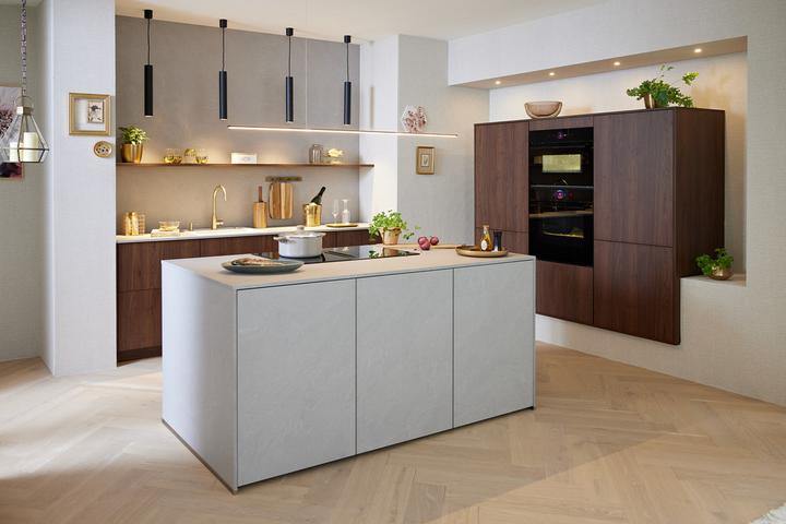 Passend zu den Pastelltönen und grünen Akzenten sind Fronten und Elemente in heller Eiche eine harmonische Kombination. Zusammen mit Naturstein oder Keramik für die Arbeitsplatten zieht 2026 ein frischer, natürlicher Look in die Küche. Weitere trendige Highlights setzen Armaturen in Bronze oder Gold, die jeder Küche einen eleganten Twist verleihen.