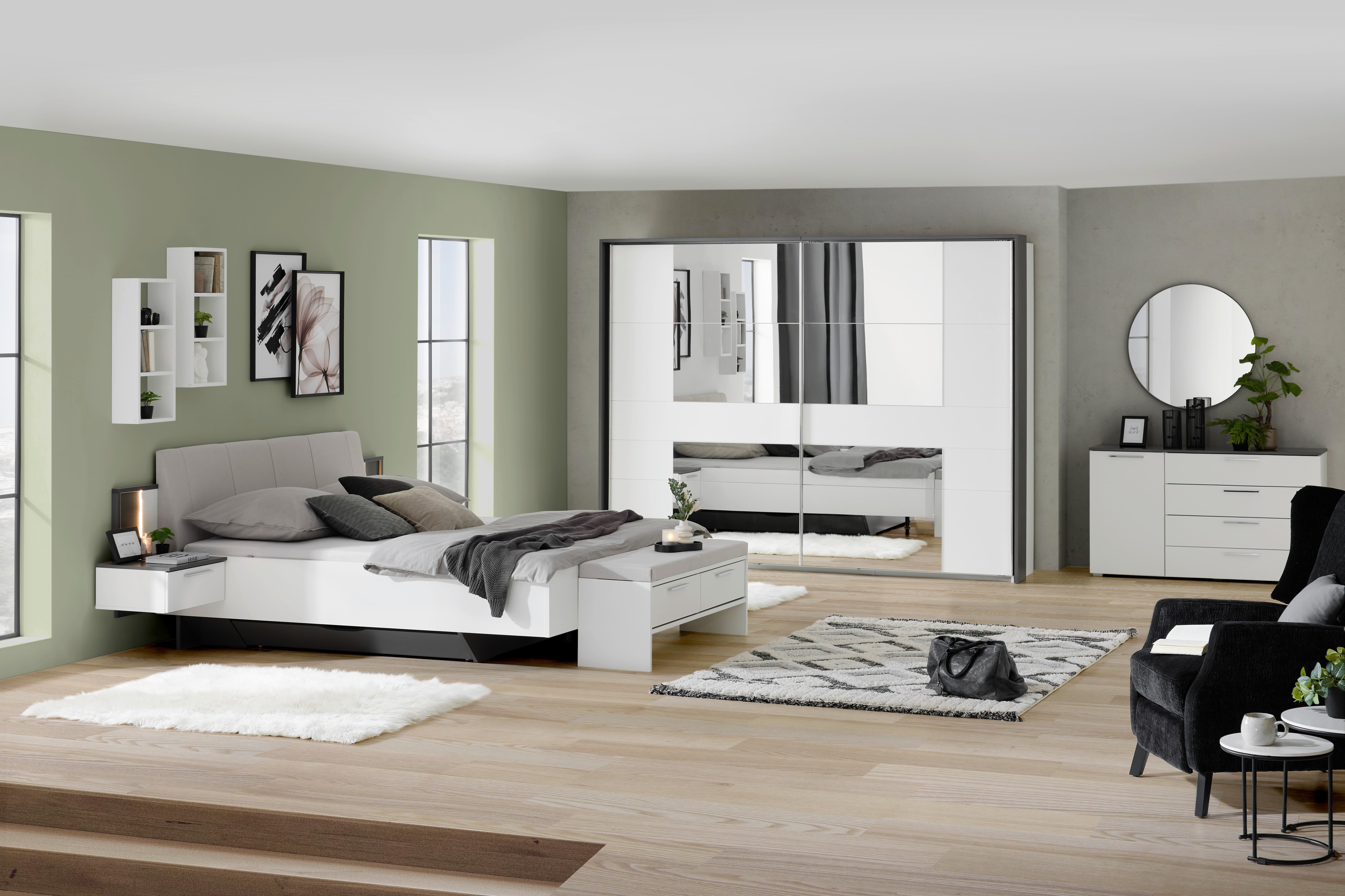 Die Schlafzimmer-Serie Caspio besticht durch ihre weiß/grauen, schlichten Möbel, die ein modernes und zugleich zeitloses Design verkörpern. Die klare Linienführung und das minimalistische Erscheinungsbild schaffen eine ruhige Atmosphäre, die perfekt zur Entspannung einlädt. Die weißen Oberflächen verleihen dem Raum Helligkeit und Weite.