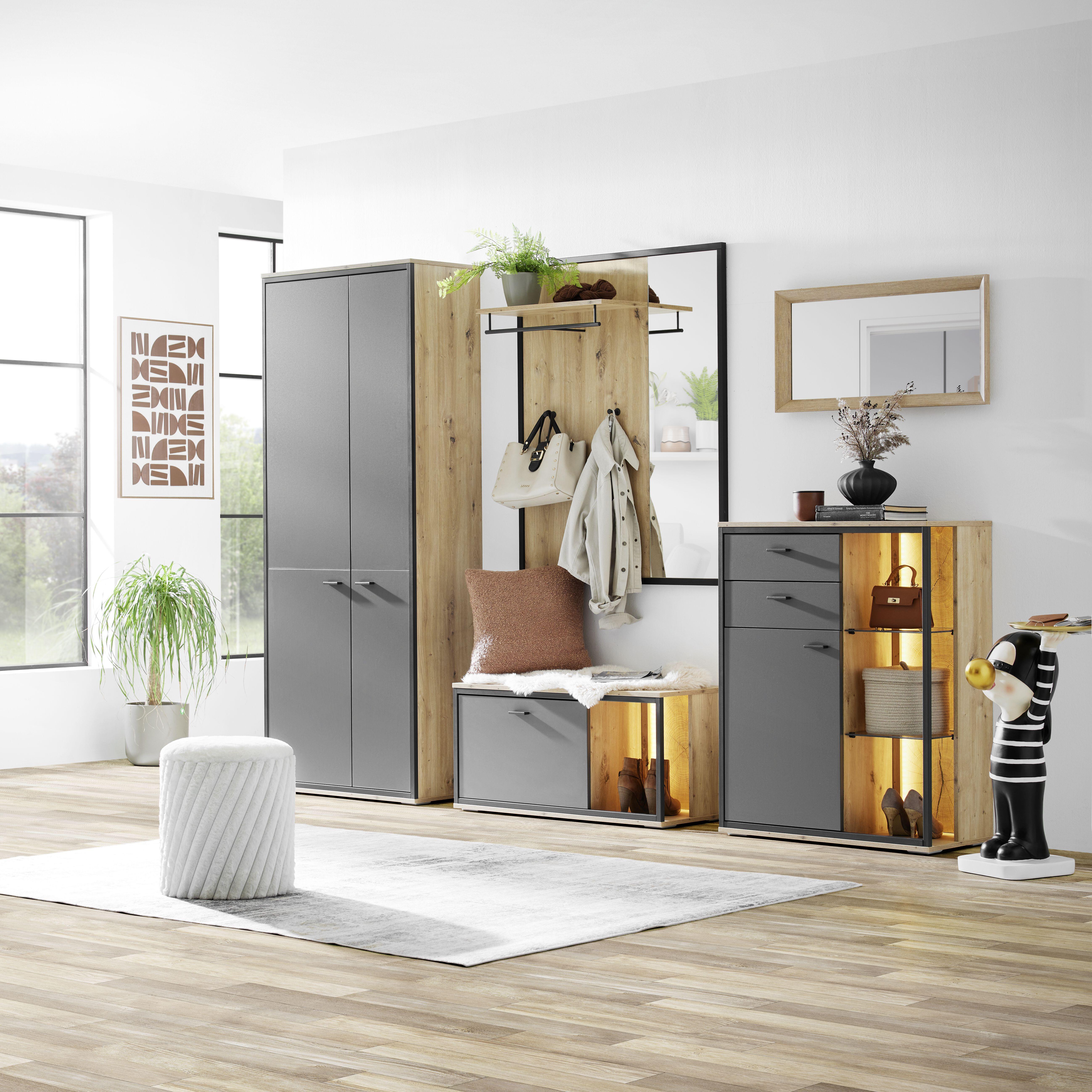Mit der Florzenz Serie gestalten Sie Ihren Flur modern, funktional und einladend. Die Kombination aus grauer Eiche und schwarzen Akzenten sorgt für einen wohnlichen Charakter mit klaren Kontrasten – ideal für einen harmonischen Empfangsbereich.
