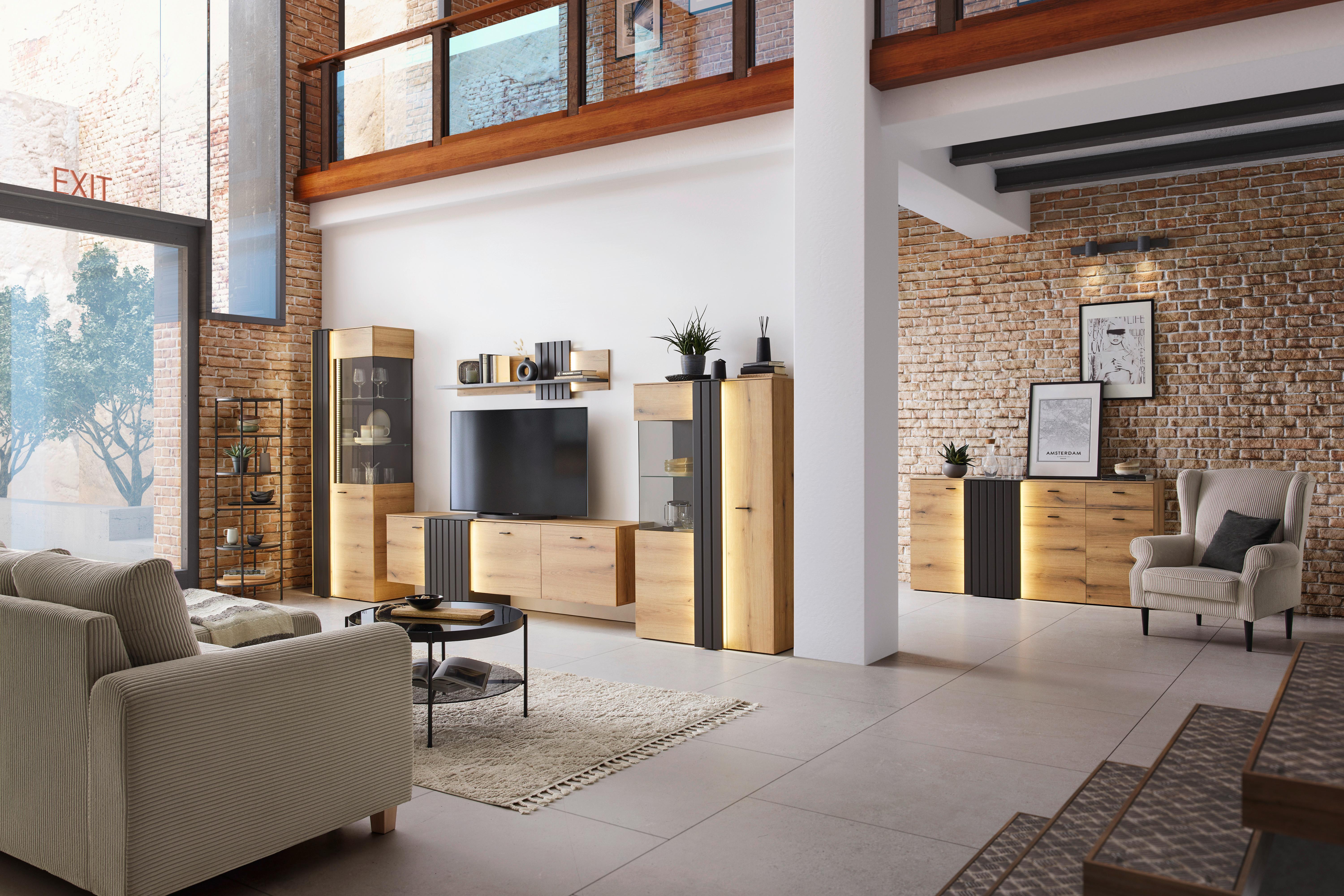 Die Wohnzimmerserie Verdana - Einzigartiges Design, Stilvoll und Funktional! Die schlichte Eiche, die der gesamten Serie eine gewisse Ruhe verleiht und sich durch die zeitlose Farbgebung nahtlos in verschiedene Einrichtungsstile einfügt. Das Design der Möbel wird durch graue Elemente Aufgewertet und überrascht mit einer integrierter LED Beleuchtung. Mit der Serie Verdana werden Sie Ihr Wohnzimmer perfekt in Szene setzen.