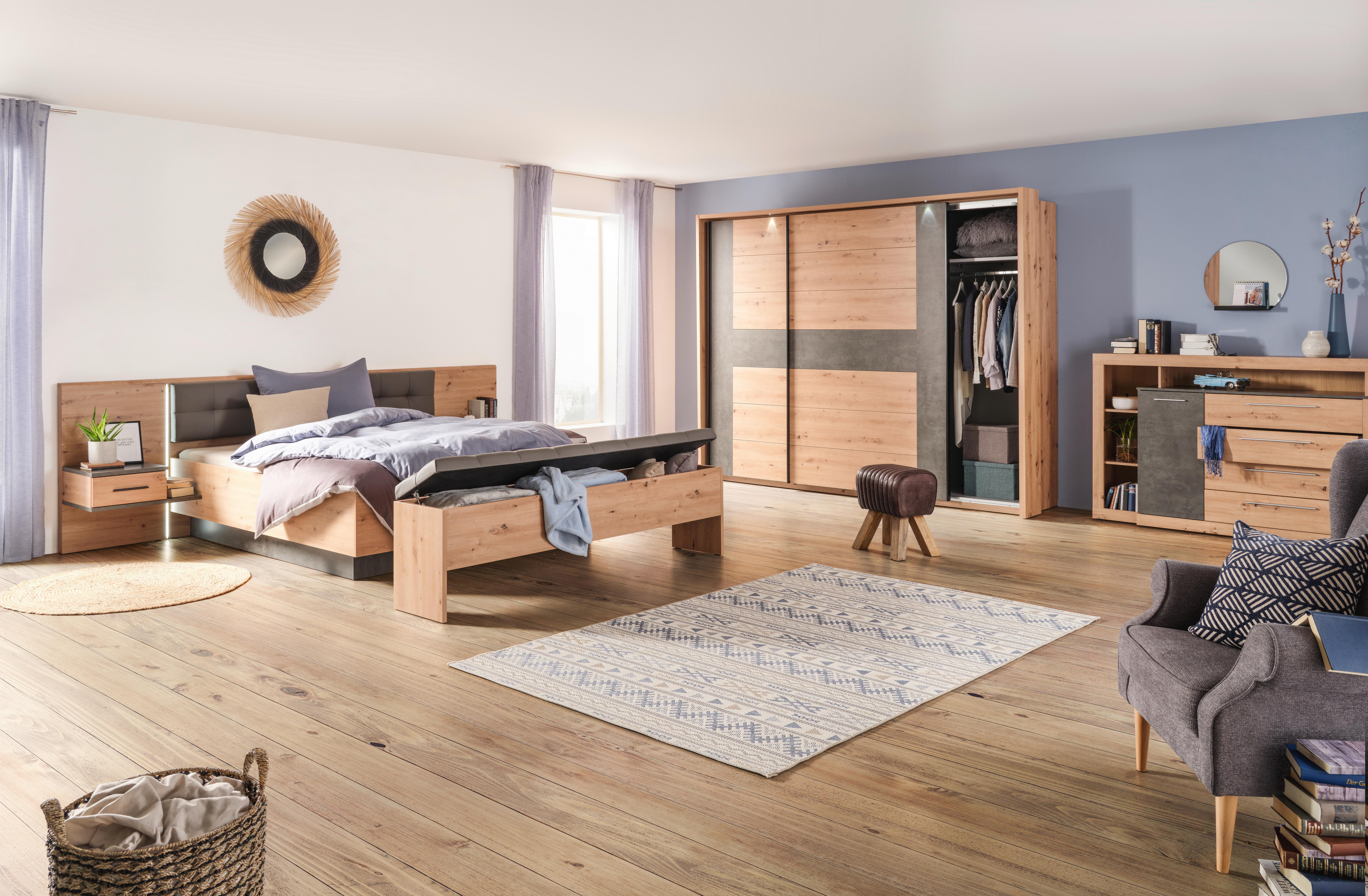 Sie möchten Ihr Schlafzimmer natürlich gestalten? Dann ist die Serie Chanton genau die Richtige für Sie! Mit dunklen Tönen und Kiefernholz wird eine gemütliche Atmosphäre geschaffen. Dank großzügigem Schwebetürenschrank, modernem Sideboard und praktischer Bettbank bietet die Serie zudem genügend Stauraum.