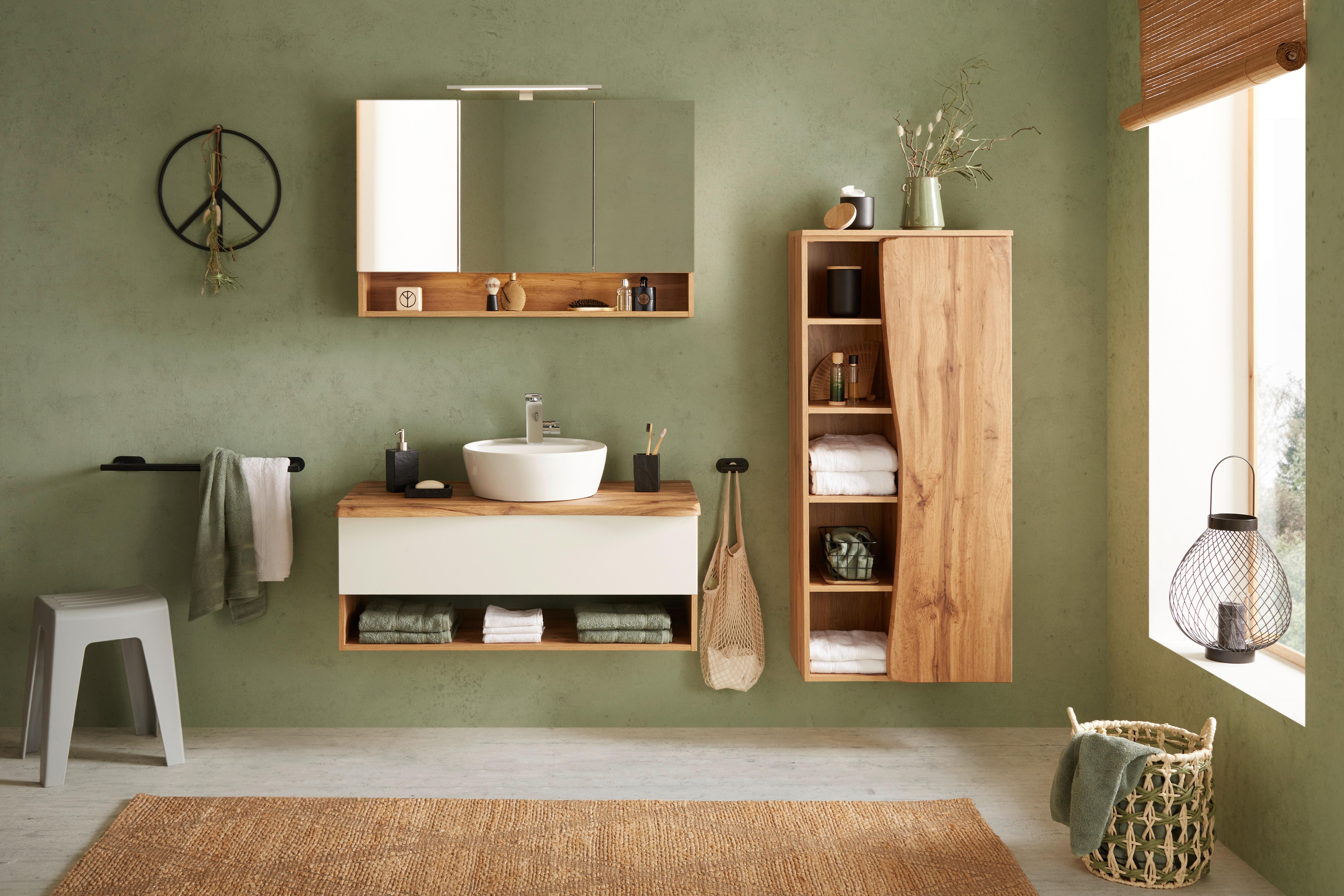 Unsere Badezimmerserie Sölden zeichnet sich durch offene Regale aus, die viel Platz für Dekoartikel bieten. Dadurch können Sie im Handumdrehen einen neuen Look für Ihre Wellnessoase kreieren und Ihre persönliche Note einbringen. Ob Blumen, Handtücher oder andere Accessoires - Ihrer Kreativität sind keine Grenzen gesetzt! Geschlossene Elemente bieten ausreichend Platz für Ihre Badezimmerutensilien und sorgen dafür, dass alles ordentlich und griffbereit verstaut werden kann.