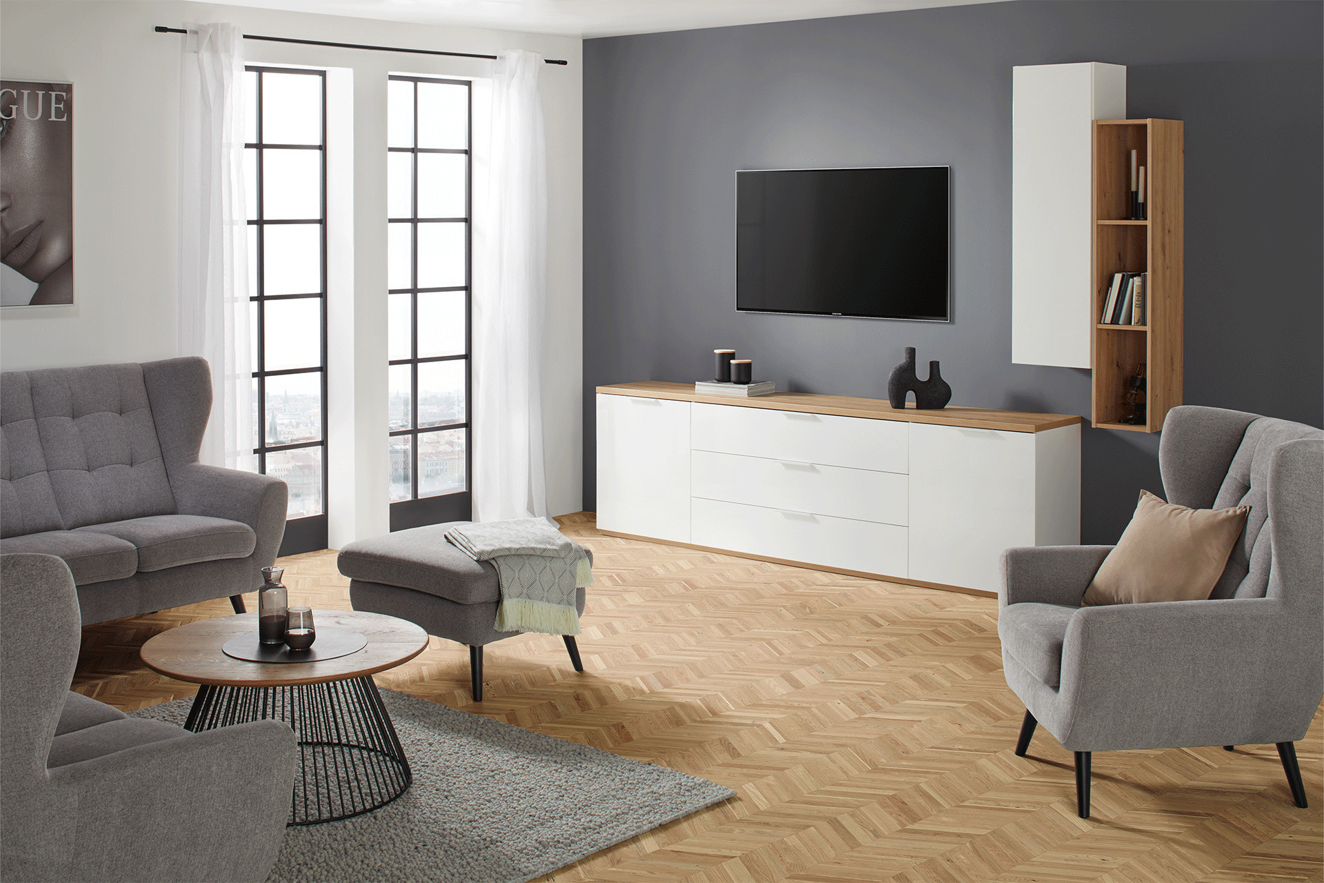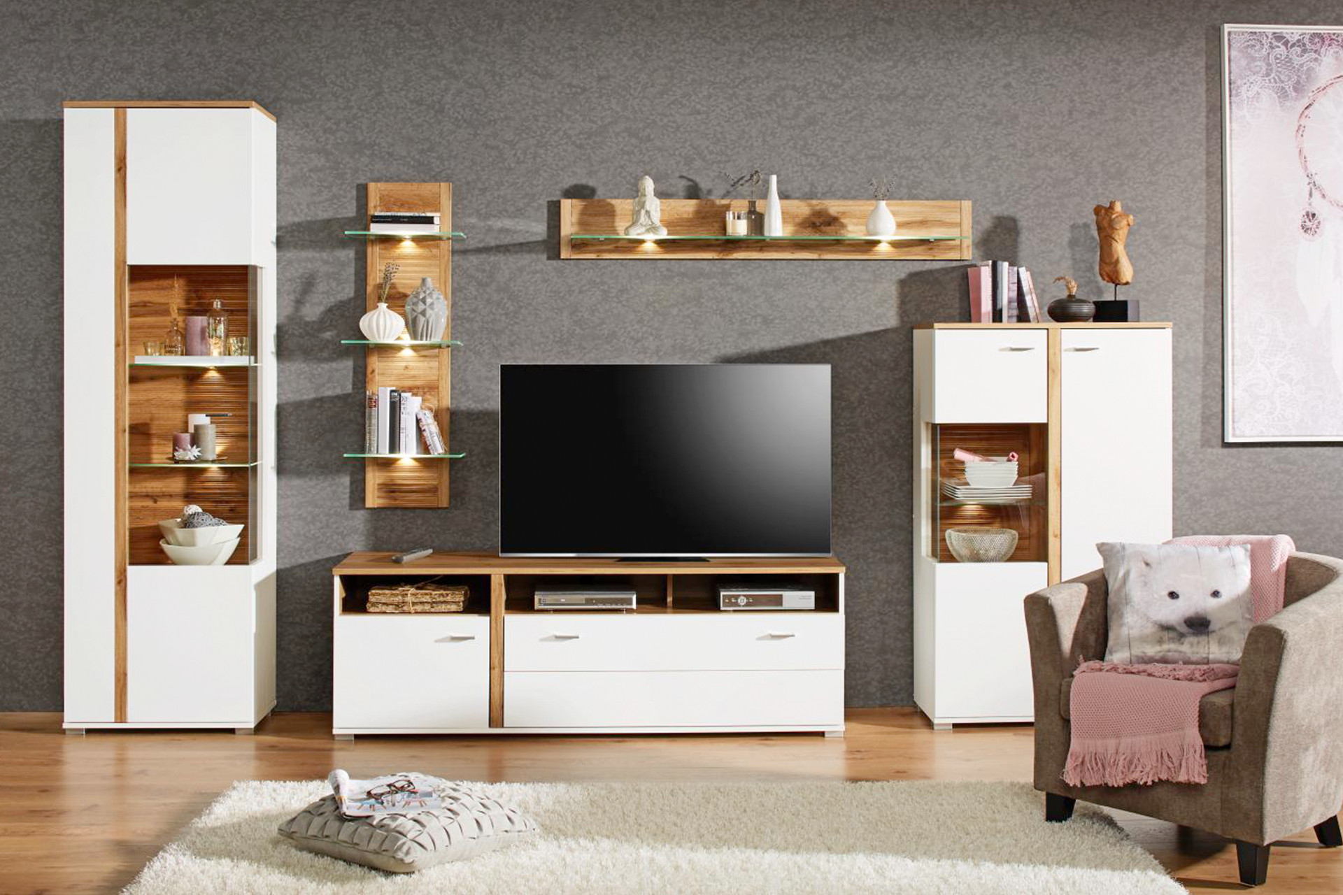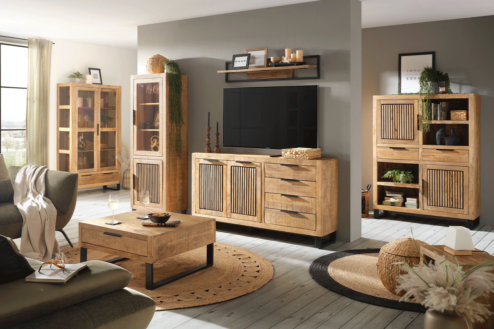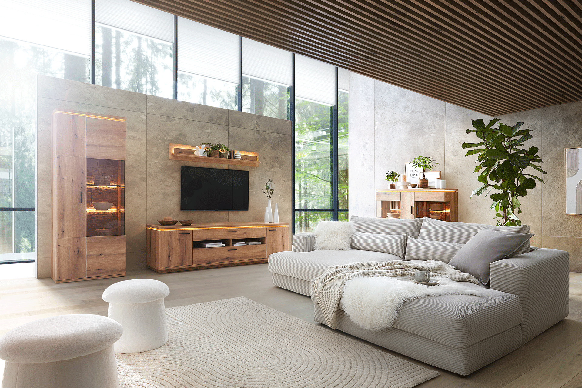 Die Materialien sind bei deinem neuen Wohnzimmer enorm wichtig. Denn nicht nur der Stil, sondern auch Farben und Holzarten müssen zu dir passen. Ein cooler Material-Mix ist dabei eine gute Wahl, denn er sorgt für clevere Abwechslung zwischen sonst eher zurückhaltenden Möbeln. Deine Wohnzimmerserie kann aus Elementen in Schwarz, Weiß oder Grau und ebenso aus Werkstoffen wie Akazie, Mangoholz oder Eiche bestehen. Ganz egal, ob du dich für moderne Wohnzimmermöbel oder Möbel aus Holz entscheidest – probiere doch mal etwas Neues und wage dich an trendige Kombinationen. Dann wird deine neue Wohnzimmerserie sicher zum Gesprächsthema beim nächsten Spieleabend mit Freunden.