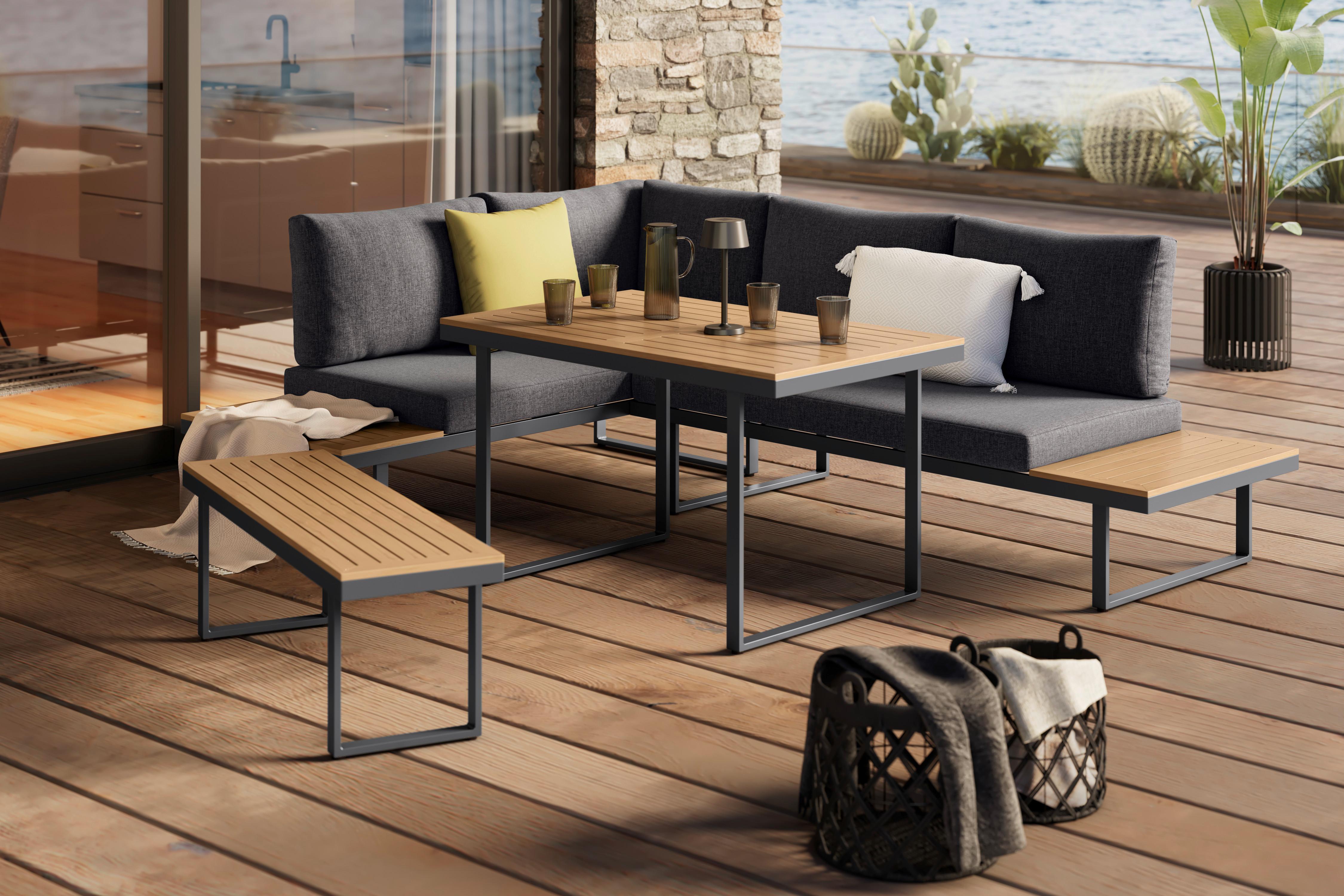 Diese Loungegarnitur in edlem Dunkelgrau vereint Komfort und praktischen Nutzen. Die Kissen sind abnehmbar, waschbar und bestehen aus pflegeleichtem, imprägniertem Olefin-Webstoff, der besonders widerstandsfähig gegen Feuchtigkeit und Schmutz ist. Die seitliche Ablage in Naturfarbe bietet Platz für Essen, Getränke oder Accessoires und setzt einen dezenten Kontrast zum dunklen Stoff – perfekt für entspannte Stunden drinnen oder draußen.