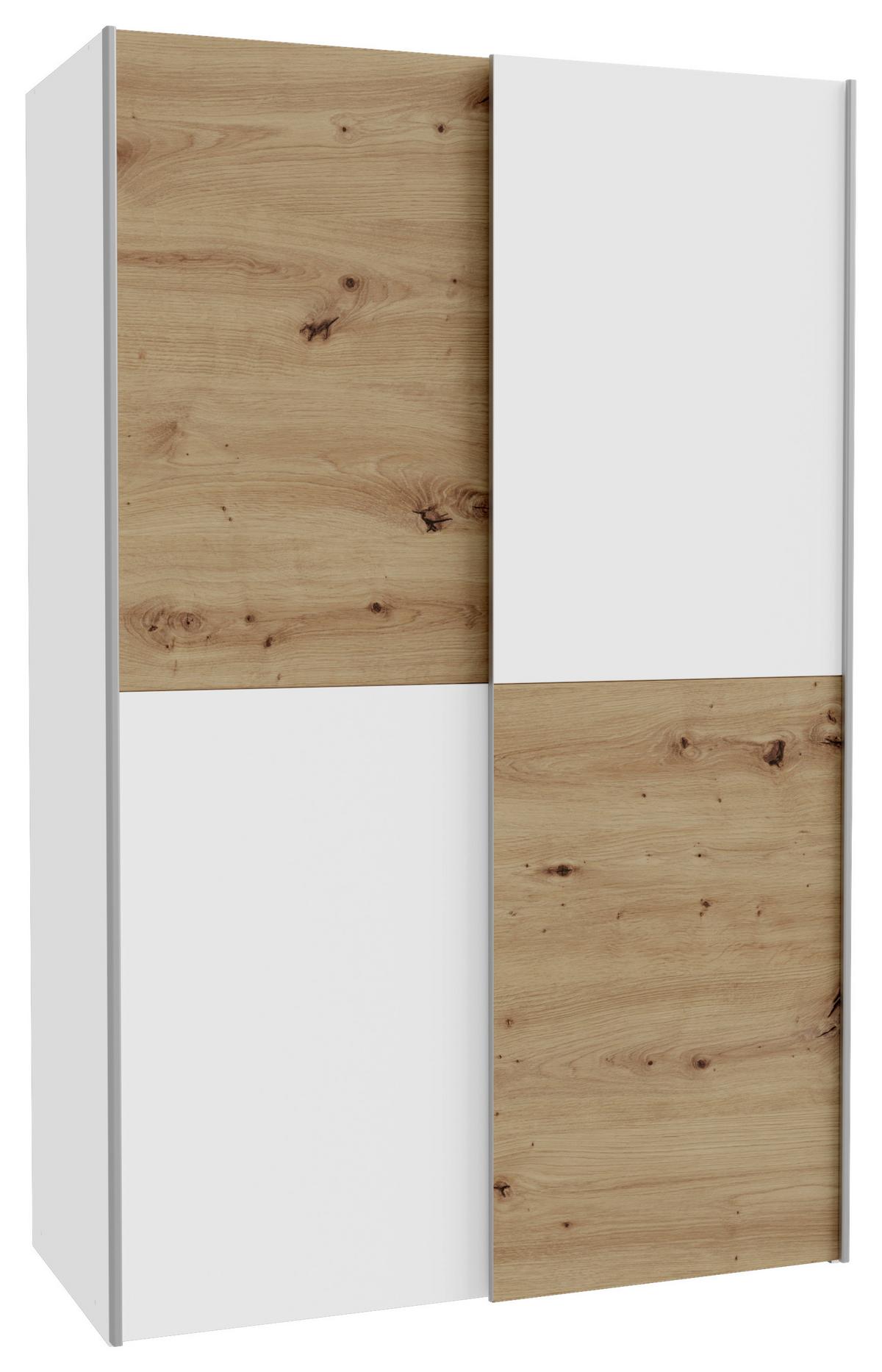 Dieser Schwebetürenschrank vereint strahlendes Weiß mit dem warmen Ton von Eiche Artisan und schafft so eine elegante und moderne Optik für Ihr Schlafzimmer. Die zwei Schwebetüren sind in vier harmonische Felder gegliedert und fügen sich besonders platzsparend in kleinere Räume oder enge Ecken ein. Ein Möbelstück, das Stil und Funktion perfekt verbindet.