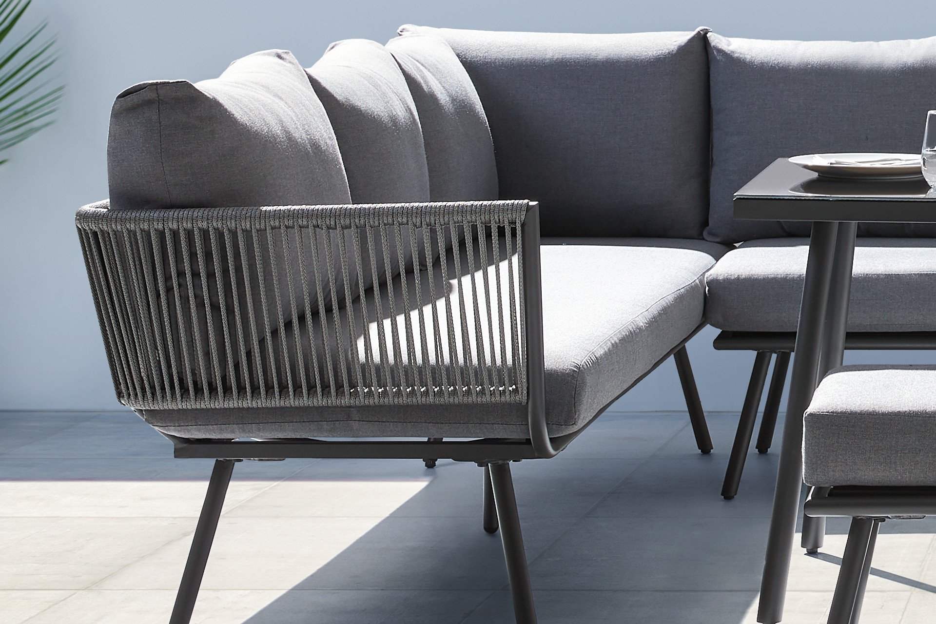 Bringen Sie Eleganz und Innovation in Ihren Außenbereich – mit einem Gartenmöbel-Set, das mit seinen Armlehnen aus raffinierter Seilbespannung zum Blickfang wird. Die Kombination aus modernen Materialien und einem durchdachten Design macht dieses Gartenmöbel-Set ideal für Terrassen, Balkone oder Gartenbereiche.