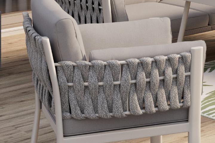 Gestalten Sie Ihren Außenbereich zu einer eleganten Wohlfühloase mit dieser exklusiven Loungegarnitur. Die Armlehnen und Rückenlehnen aus hellgrauem Textilgeflecht verleihen dem Set eine zeitlose Ausstrahlung. Das langlebige Material überzeugt nicht nur optisch, sondern auch durch seine angenehme Haptik. Für ein besonders gemütliches Sitzerlebnis sind passende Kissen bereits im Lieferumfang enthalten.