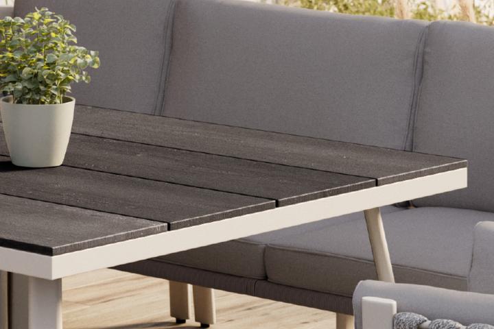 Der hohe Tisch bietet die perfekte Höhe, um entspannt und komfortabel gemeinsam zu essen – ideal für lange Abende mit Familie und Freunden. Sein weißes Gestell verleiht ihm eine moderne Leichtigkeit, während die dunkelgraue Tischplatte in Holzoptik für eine warme, natürliche Note sorgt. Die Platte ist wetterfest, robust und pflegeleicht, sodass sie allen Witterungsbedingungen mühelos standhält und stets gepflegt bleibt.