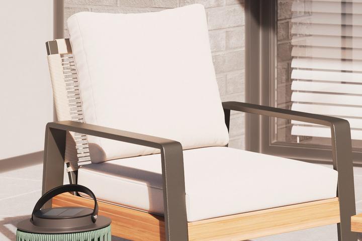 Die Loungegarnitur überzeugt mit ihrem eleganten und modernen Design. Die Kissen in einem sanften Creme-Ton verleihen dem Set eine edle Note, während der Polyesterbezug für besondere Strapazierfähigkeit und einfache Pflege sorgt. Diese robuste Synthetikfaser eignet sich ideal für den Außeneinsatz. Der stabile Rahmen aus hochwertigem Aluminium in Anthrazit setzt einen modernen und zeitlosen Akzent. Die Akazienholz-Elemente in Teakfarben ergänzen das Gesamtbild und verleihen der Garnitur durch ihre natürliche Maserung und warme Ausstrahlung eine perfekte Harmonie mit den modernen Materialien.