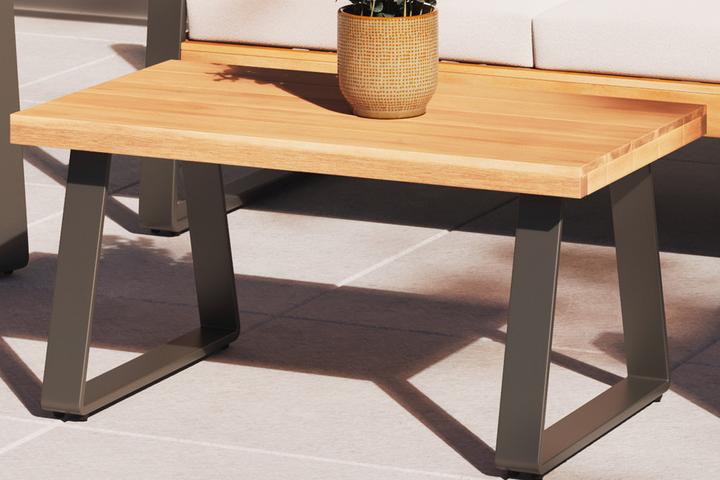 Dieser Loungegarnitur-Tisch besticht durch sein ansprechendes Design und die perfekte Verbindung natürlicher und moderner Materialien. Das hochwertige Akazienholz in warmer Teakfarbe überzeugt mit seiner robusten Struktur und einzigartigen Maserung, die jedem Tisch einen individuellen Charme verleiht. Akazienholz ist zudem besonders widerstandsfähig und ideal für den Außenbereich geeignet. Der stabile Rahmen aus Aluminium in schlichter, moderner Optik sorgt für Langlebigkeit und Widerstandsfähigkeit gegenüber Witterungseinflüssen. Leicht und dennoch stabil, verleiht das Aluminium dem Tisch eine zeitlose Eleganz.