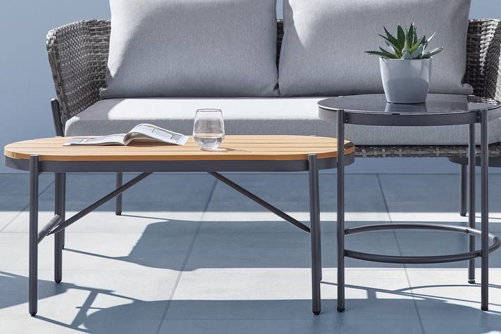 Diese moderne Loungegarnitur vereint elegantes Design mit praktischer Funktionalität und hochwertigen Materialien. In stilvollen Schwarz- und Naturtönen gehalten, fügt sie sich mühelos in jedes Ambiente ein. Ein besonderes Highlight stellt der ovale Tisch mit einer schicken Polywood®-Tischplatte in warmem Braun dar, die nicht nur visuell beeindruckt, sondern auch besonders pflegeleicht und wetterbeständig ist. Abgerundet wird die Garnitur durch einen kleinen, runden Beistelltisch in elegantem Schwarz mit einer edlen Glasplatte, der eine praktische Ablagefläche für Getränke, Dekoration und andere Utensilien bietet und dem Gesamtbild eine zusätzliche moderne Note verleiht.