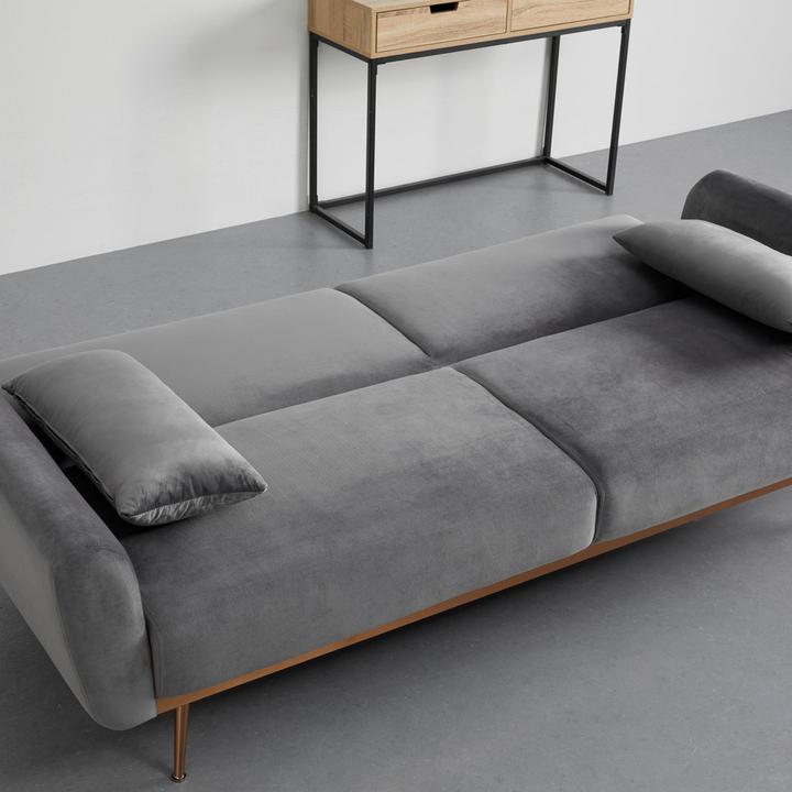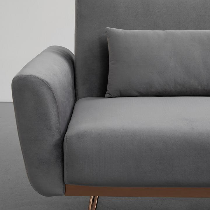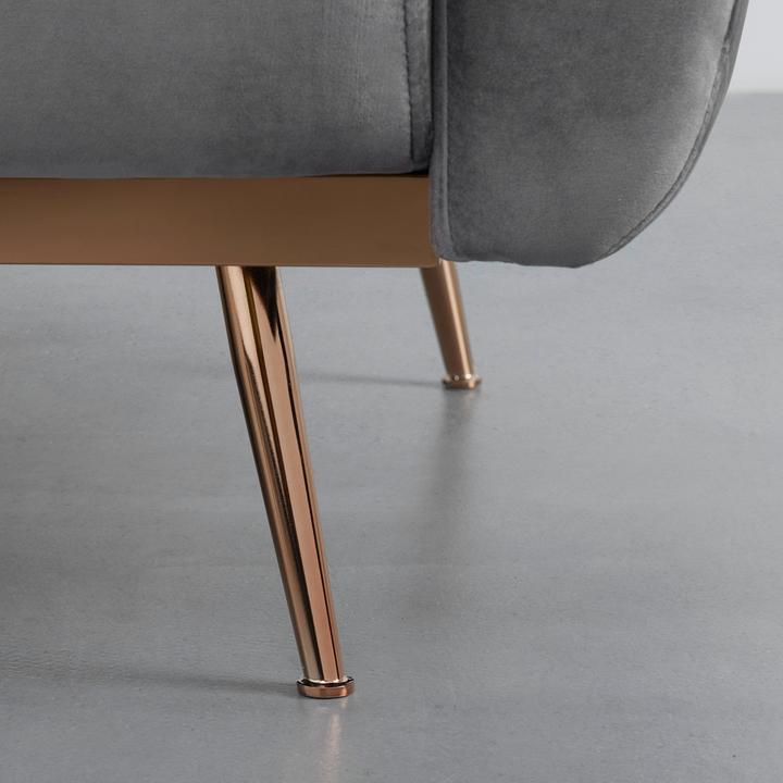 Kupferfarbene Metallbeine verleihen dem Sofa eine luxuriöse Note und setzen edle Akzente, die besonders gut zu eleganten Einrichtungsstilen passen. Kupfer harmoniert hervorragend mit dem Grau des Samtbezugs. Dank der widerstandsfähigen Eigenschaften von Metall bleibt das Material auch bei höheren Belastungen bis zu 350 kg formbeständig.