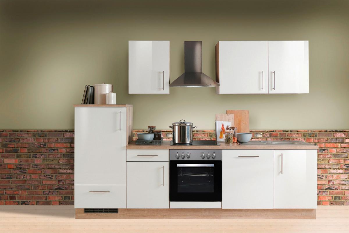 Menke Küchenblock Premium Weiß Hochgl./Eiche ca. 280 cm - Weiß Hochglanz/Silberfarben, KONVENTIONELL, Holzwerkstoff/Metall (280cm) - Menke