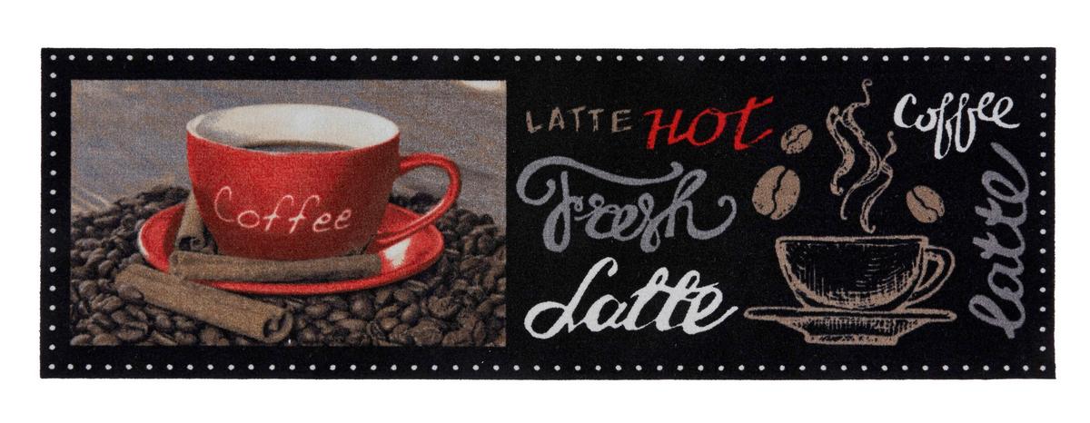 Die pflegeleichte Fußmatte ist mit einer roten Kaffeetasse und Schriftzügen bedruckt und schützt den Fußboden vor Schmutz und Nässe. Zudem ist der Küchenläufer bis 30°C waschbar und lässt sich schnell zusammenrollen.