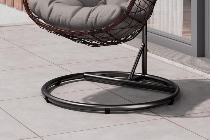 Der Hängesessel ruht auf einem robusten, pulverbeschichteten Metallgestell, das für einen sicheren Stand sorgt und sanftes Schwingen ermöglicht. Die runde Basis gewährleistet Stabilität auf verschiedenen Untergründen und verleiht dem Sessel eine moderne, minimalistische Optik.