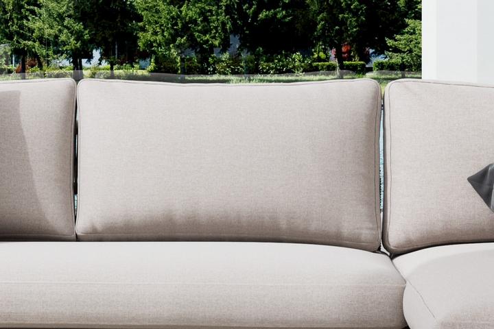 Die Sitzpolster der Loungegarnitur bieten dank ihrer formstabilen Schaumstofffüllung optimalen Halt und ein angenehmes Sitzgefühl. Die abnehmbaren Bezüge aus imprägniertem Webstoff in elegantem Taupe sind nicht nur optisch ansprechend, sondern auch besonders pflegeleicht und waschbar, sodass sie dauerhaft ihre edle Ausstrahlung bewahren. Ergänzt wird das Set durch drei weiche Rückenkissen mit Polyesterfüllung, die für zusätzlichen Komfort sorgen. Auch diese sind mit einem waschbaren Bezug in Taupe versehen, was eine einfache Reinigung ermöglicht und die Garnitur stets gepflegt aussehen lässt.