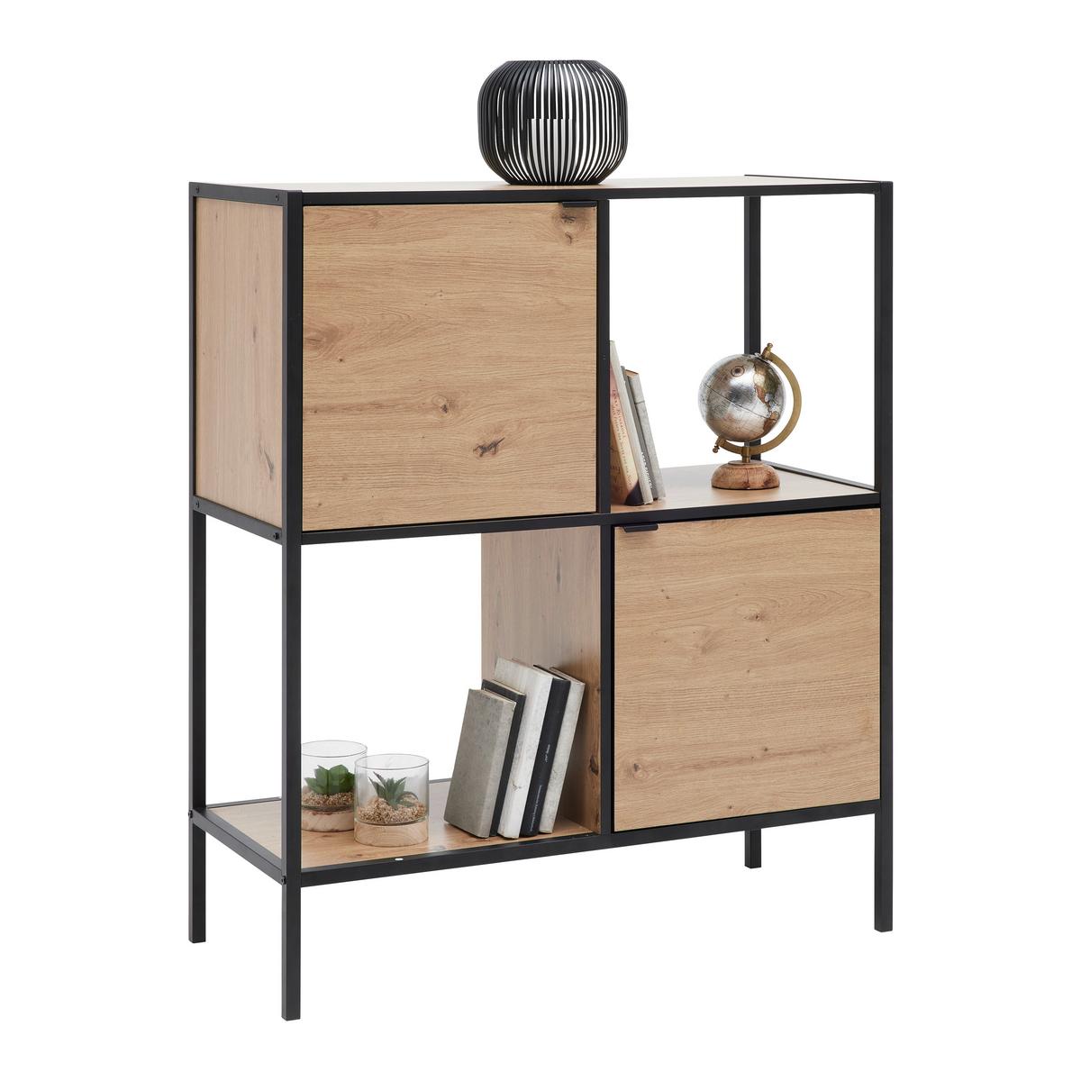 Mit seinen Abmessungen von ca. 90 x 106 x 40 cm (B x H x T) passt das Regal auch in kleinere Räume. Die zwei Drehtüren, jeweils mit Anschlag links und rechts, bieten zusätzlichen Stauraum und schützen deine Gegenstände vor Staub. Die Füße des Regals sind eckig und ebenfalls schwarz pulverbeschichtet. Das Mömax Regal QUEENS ist nicht nur ein praktisches Möbelstück, sondern auch ein echtes Design-Statement für dein Zuhause.
