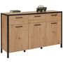 Mit der attraktiven Kombination aus tiefem Schwarz und warmen Eichetönen setzt dieses Sideboard einen eleganten Akzent im Wohnraum. Hinter drei Drehtüren und in drei leichtgängigen Schubladen bietet es großzügigen Platz für Geschirr, Deko oder Alltagsutensilien und sorgt so für Ordnung und Übersicht. Die markanten schwarzen Kantengriffe greifen das moderne Design auf und betonen die klare, geradlinige Formensprache des Möbelstücks.