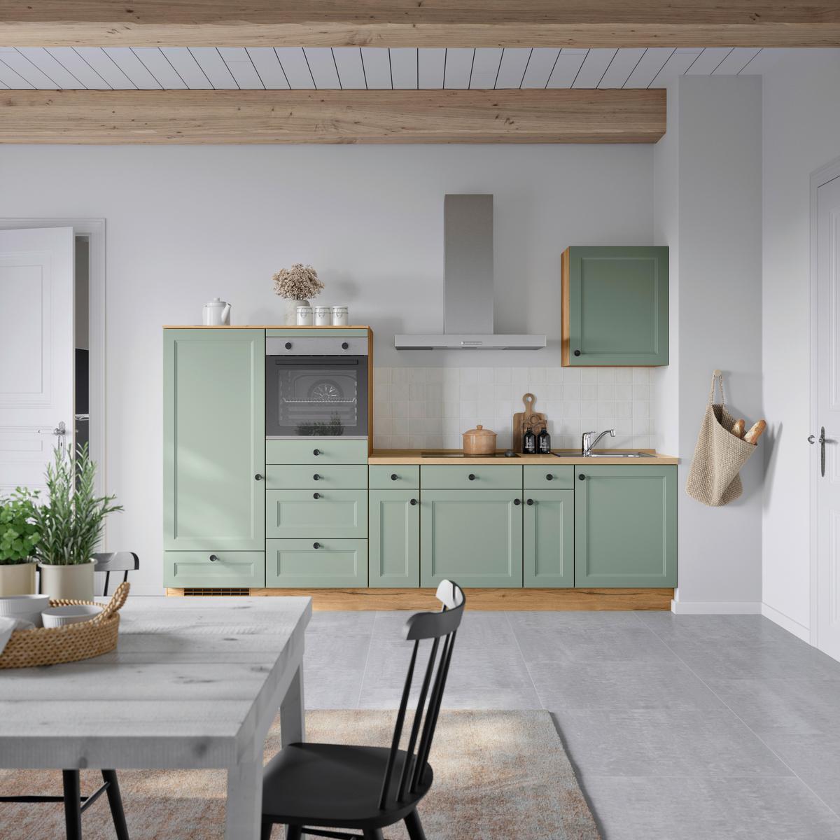 Küchenblock Cascada Low m. Geräten Schilfgrün - Schilfgrün/Eichefarben, MODERN, Holzwerkstoff/Metall (300cm) - Nobilia