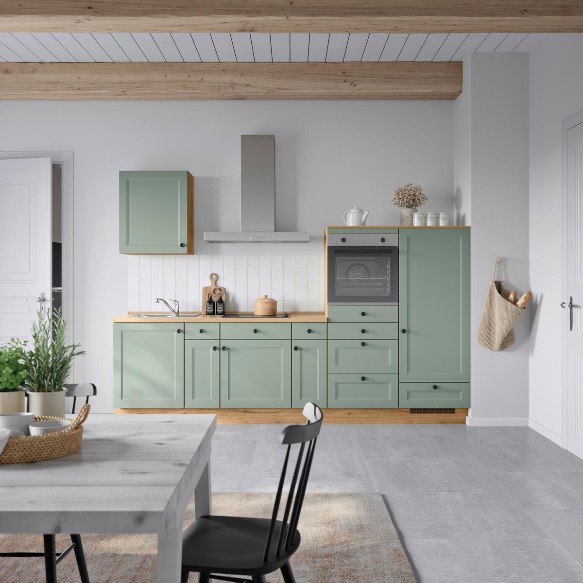 Küchenblock Cascada Low m. Geräten Schilfgrün - Schilfgrün/Eichefarben, MODERN, Holzwerkstoff/Metall (300cm) - Nobilia