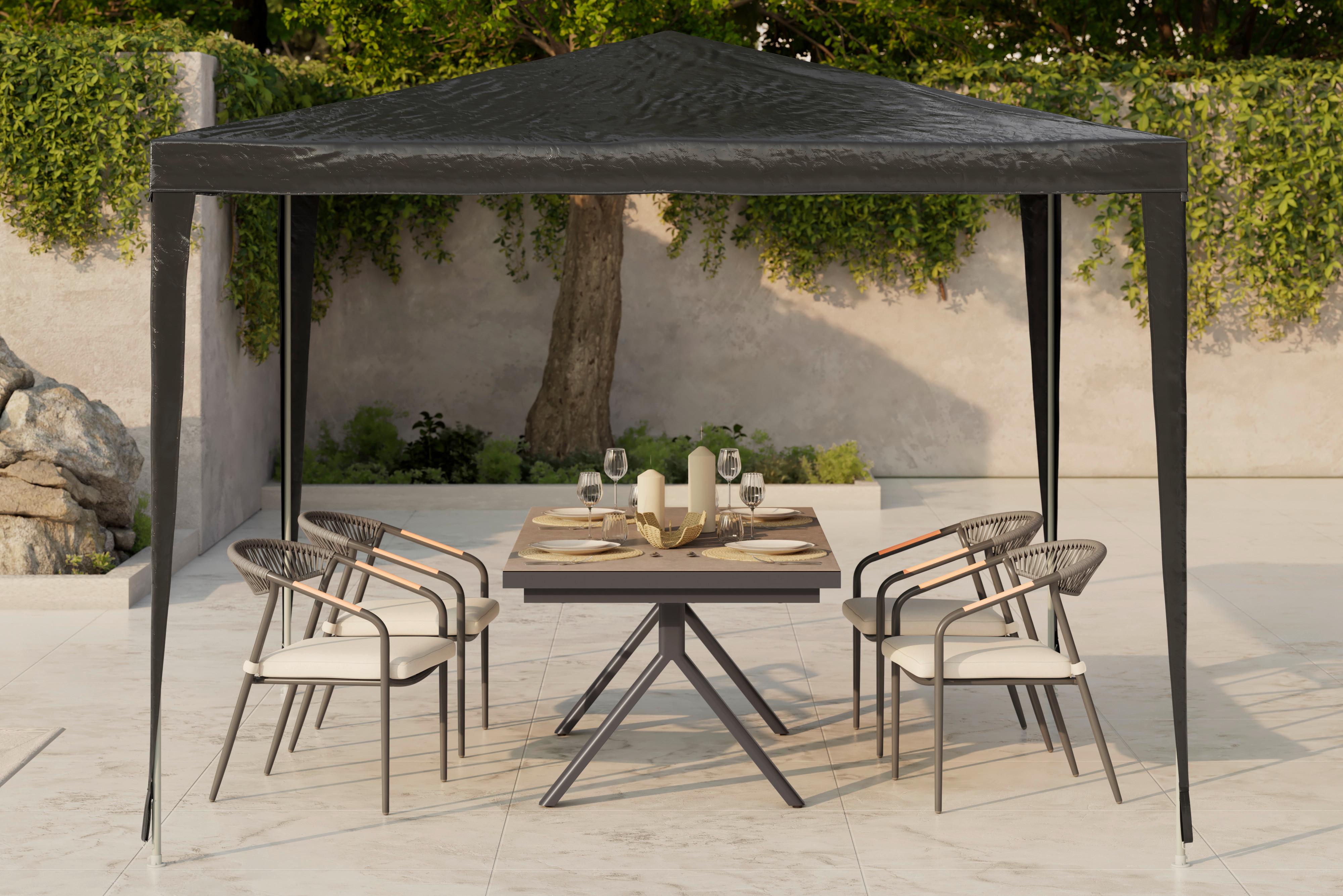 Dieser quadratische Pavillon in Dunkelgrau kombiniert modernes Design mit hoher Stabilität. Das Dach aus widerstandsfähigem Textil-Webstoff spendet angenehmen Schatten und schafft einen geschützten Bereich im Freien. Besonders praktisch: Das Material ist pflegeleicht und macht den Pavillon alltagstauglich sowie wartungsarm.