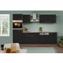 Die Front in Schwarz mit einer Stärke von ca. 16 mm wird durch moderne Metallgriffe in Edelstahlfarben ergänzt, die dem Möbelset eine zeitgemäße Note verleihen.