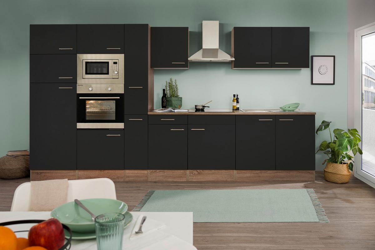 Dieser Küchenblock verfügt über insgesamt 9 Türen und 1 geräumige Schublade, die Ihnen eine optimale Organisation und Aufbewahrung Ihrer Küchenutensilien ermöglichen. Die elegante Eichefarbe verleiht Ihrer Küche eine warme und einladende Atmosphäre, während die schwarzen Akzente einen modernen Touch hinzufügen.