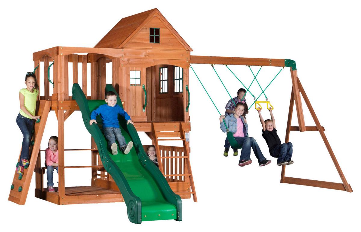 - Zubehör inklusive: Montagematerial, Bodenanker, Rutsche, Schaukel, Kletterwand